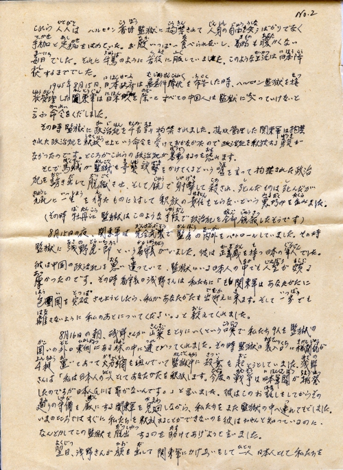 On the morning of August 16, on the excuse of digging wild vegetables, Mr. Asano led us 9 people outside the prison wall, in the woods in the east. At that time the prison gate was guarded by solders with four machine guns, which formed a crossfire coverage, the entire prison was immersed in a killing atmosphere. Mr. Asano said: “Now I would try to free you as a Japanese. This war was waged by the Japanese war lords, the Japanese people are innocent”. He looked around the guarding Kwantung Army in the surrounding area, knowing he was unable to let us go immediately, he had no other way but to lead us back to the prison, but he said he would find ways to help us leave this human hell.