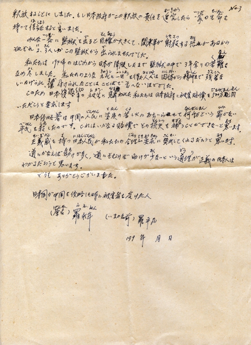 From early 1942 to the surrender of Japan, we suffered hardship for as long as three years in the prison, and had a close shave with death and barely survived, the savage destruction and damage we received both physically and mentally cannot be described in words, for this purpose we victims of the Japanese Invasion Army resolutely demand the Japanese government to offer 5 million yuan as damage compensation.