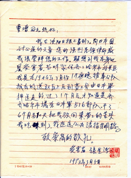 我在沈阳日报上看到了,向日本国讨公道的文章。您的强烈民族使命感我很崇拜您的工作。联想到我本身也是受害者。当时家住齐齐哈尔市北关区。我是在1944年3月份1个夜晚被奉公队抓去的。送到区上后到劳工会由日本军押送走的。过了1个月后,才知道是齐齐哈尔市城东日本军516部队。干了6个月[零]10天,把我放回来。劳工的苦头我吃到了,我应怎么办,请指条明路。
