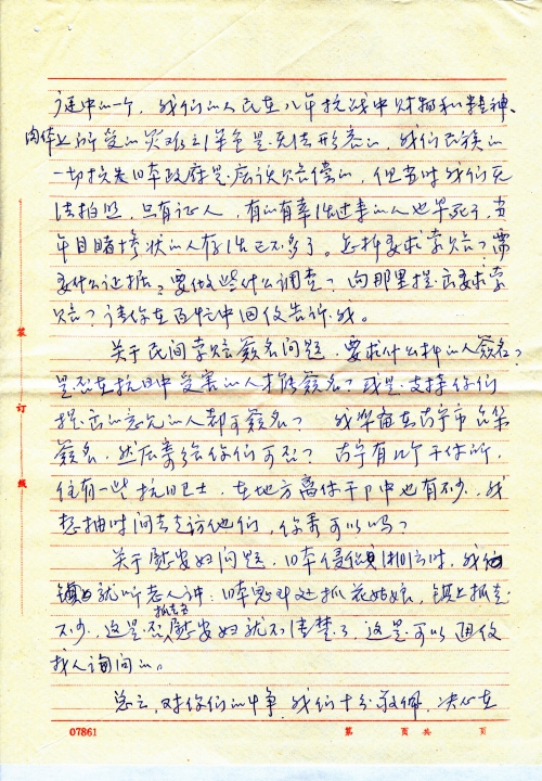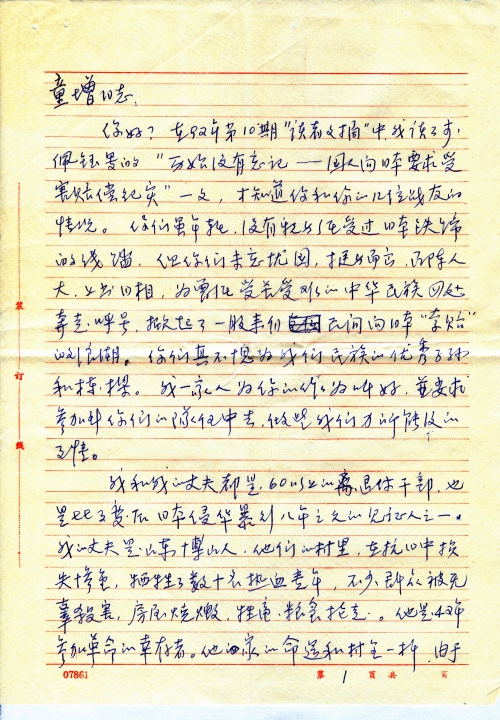 童增同志:我们的家只是中华大地千万个受难家庭中的一个。我们的人民在八年抗战中财物和精神、肉体上所受的灾难之深是无法形容的。我们民族的一切损失日本政府是应该赔偿的,但当时我们无法拍照,只有证人,有的有幸活过来的人也早死了,当年目睹惨状的人存活已不多了。怎样要求索赔?需要什么证据?要做些什么调查?向哪里提出要求索赔?请你在百忙中回信告诉我。