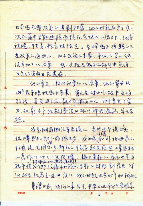 他的舅父,抗日初参加八路军,他的舅母及两个表弟妹被鬼子杀害,舅父在对日作战中负伤致残,复[原]回了后,数十年孤身一人,由于丧失了劳力,仅靠生产队救济度日,难以解决温饱,早已去逝。