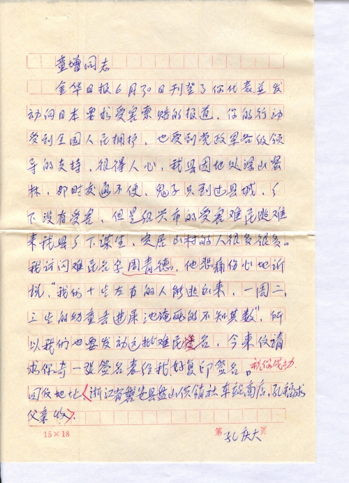 金华日报6月30日刊登了你代表并发动向日本要求受害索赔的报道。你的行动受到全国人民拥护,也受到党政军各级领导的支持,很得人心,我县因地处深山密林,那时交通不便,鬼子只到过县城,乡下没有受害,但是绍兴市的受害难民逃难来我县乡下谋生,定居山村的人很多很多。我访问难民名字周青德,他悲痛伤心地诉说:“我们十岁左右的人能逃出来,一周、二、三岁的幼童丢进屎池淹死的不知其数。”所以我们也要发动这批难民签名,今来信请求你寄一张签名表给我好复印签名。祝你成功。