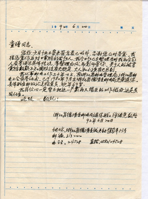 细节:你的回信已经收到很感谢,我现在整理我和家人受害的具体情况,整理好再寄给你。我(徐继尧)是从事邮电工作的,现在已经退休。