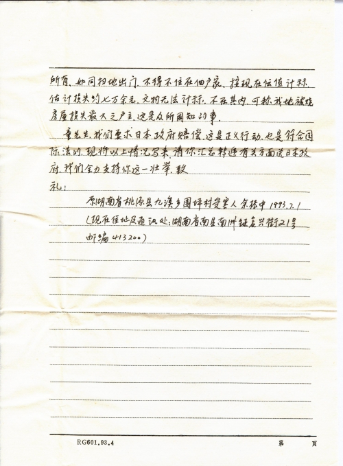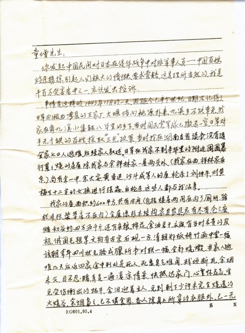The details of my story are as follows. One day in November 1943, the exact date was unclear since it was half a century ago, the Japanese Army swooped on Taoyuan from Wangjiachang, Dayandang in Li County of Western Hunan, Jiuxi Town was not spared, my home was in the rural area 8 li away from Jiuxi Xiaoji Town. Back then the KMT troops had evacuated, the Japanese army adopted “Burn All, Kill All, Loot All” policy toward unarmed common people. Back then I was still studying in school in Jishou, Hunan, and didn’t follow my family of seven persons to flee from calamity, later according to description of my family members, the Japanese Army committed heinous crimes in the vicinity of only less than half li away from our home, they burned the house of my home and Yu Xianglin’s house on both ends (my home was in the west, rooms of Xianglin’s home was in the east), there were also rooms of Yu Yizhong, Yu Daan, Huang Xiangting, Sha Doucheng were also burned, they also killed Liu Zhongwu, raped a 12 year old girl surnamed Huang before killing her, all these people were my relatives.