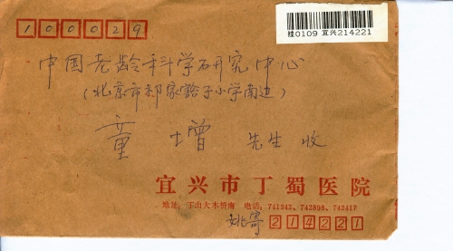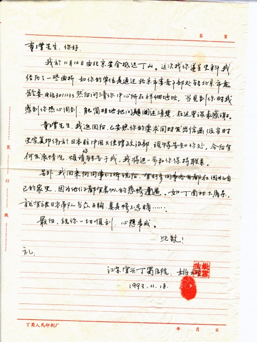 I safely arrived in Dingshan from Beijing on November 10. I experienced some twists and turns in finding you and submitting the historical materials to you. I first called Beijing Municipal Retired Cadres Department, which told me to call 3011133 to reach Beijing Municipal Committee on Aging. So I called and found out the detailed address of your center. Finally when I met you, I could feel your kindness and you properly explained the matter to me in a concise way. I’d like to express my deep gratitude to you.