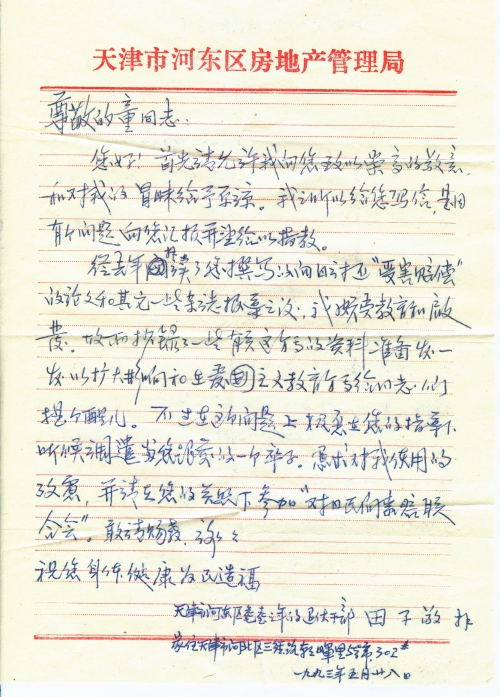 经去年读了您撰写的向日讨还“受害赔偿”的论文和其它一些杂志报案之后,我颇受教育的启发。故而抄录了一些有关这方面的资料准备发一发以扩大影响和爱国主义教育方面给同志们提个醒儿。不过在这个问题上极愿在您的指导下听候调遣当您跟前的一个卒子。恳求对我使用的考虑,并请在您的关照下参加“对日民门索赔联合会”。敢请赐教,谢谢!