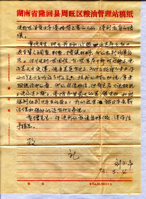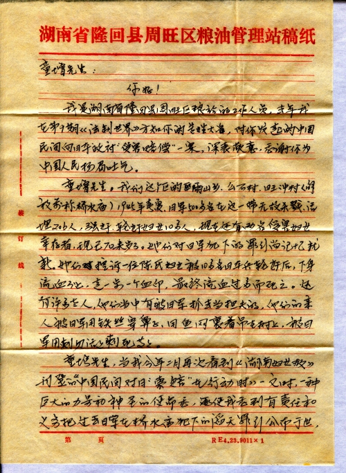 I am a staff worker at the Grain Station of Zhou Wang District, Longhui County, Hunan Province. It was from the 9th issue of “The World of Legality” last year that I learned of your illustrious name. Here I would like to express my deepest respect toward your initiating the Chinese civilian “Damage Compensation” case against the Japanese government. Thank you for making the Chinese people feel proud and elated.