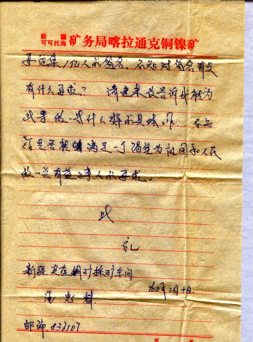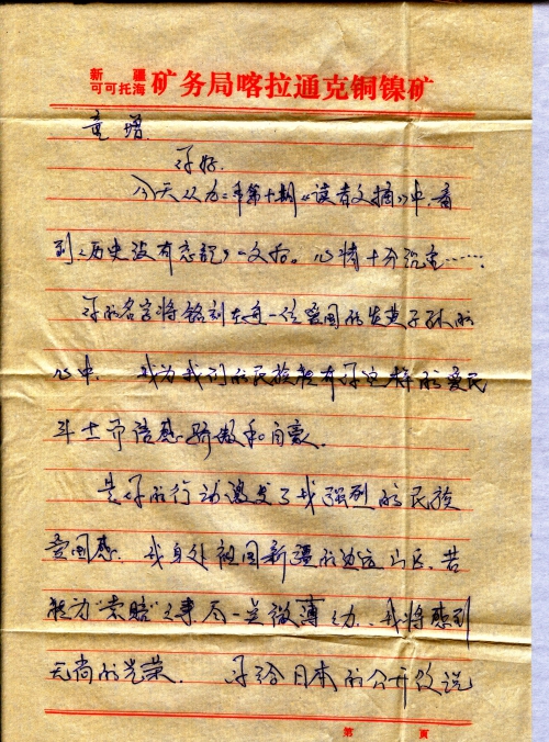 是你的行动激发了我强烈的民族爱国感。我身处祖国新疆的边远山区,若能为“索赔”之事尽一点微薄之力,我将感到无上的光荣。你给日本的公开信说要征集1亿人的签名。不知对签名有没有什么要求?请速来信告诉我能为此事做一些什么样的具体工作。不知你是否能够满足一个渴望为祖国和人民做一点有益之事人的要求。