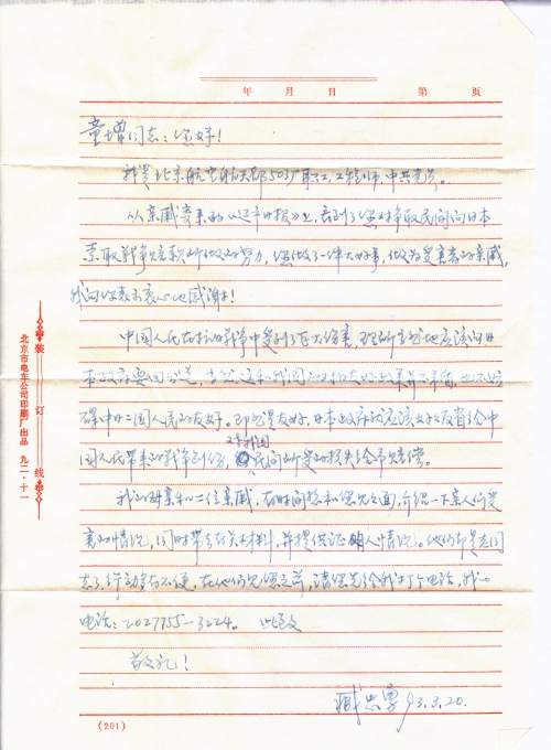 从亲戚寄来的《辽宁日报》上,看到了您对争取民间向日本索取战争赔偿所做的努力,您做了一件大好事,作为受害者的亲戚,我向你表示衷心地感谢!