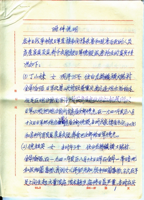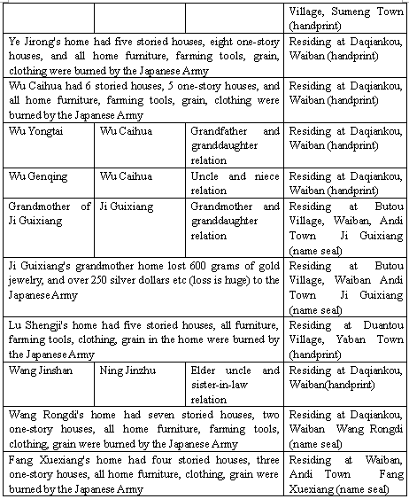 After Jinhua fell into the enemy’s hands, on June 6, 1942 of the lunar calendar, the Japanese Army mobilized massive troops to enter the South Mountain for mopping-up, ferociously attacked Chinese soldiers, and burned all villages within the South Mountain, back then my home had three storied houses and one one-story house plus home furniture, farming tools, clothing, over 1500 catties of grain, one gold ring weighing 7.5 grams, 250 grams of silver jewelry, the above things were all burned by the Japanese Army.