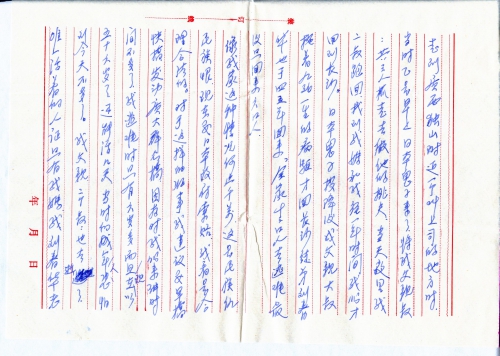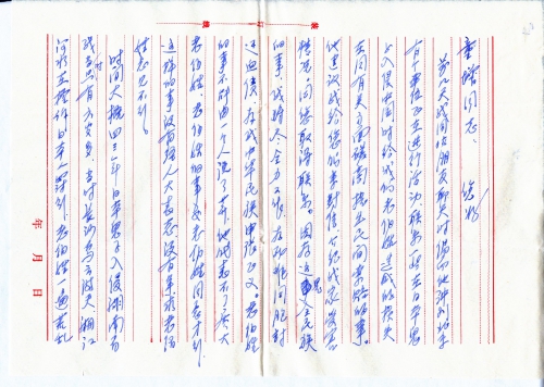 像我家这种情况何止千万,这是民族仇、民族恨,现在要日本政府索赔,我看是合理合法的。对于这样的壮事,我建议要早搞快搞,发动广大群众搞,因为对我们来讲时间不多了,我逃难时只有六岁多,而且现在[已]五十六岁了,还能活几天,当时的成年人恐怕到今天不多了。我父亲、二个叔叔也去逝了,唯一活着的人证只有我妈、我、刘春华老人了。我本人是五六年入伍,在空军工作,八二年才转业,随爱人转到石家庄的。我计划今年回长沙去,同妈妈好好讲讲这件事,在多的了解一些情况,更多的联络一些难友,成立一个小组给您们以[声]援,我们共同努力向日本政府讨还血债,以报答我们死去的亲人,今来信请入档备查,并盼望您回信给予指示。