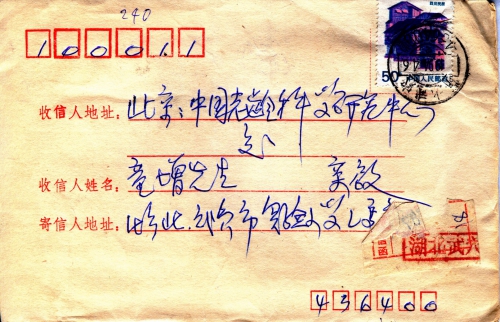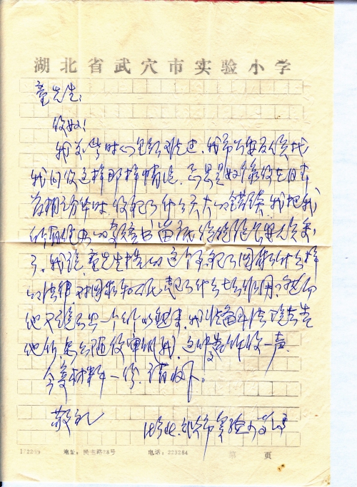 我前些时心理很难过。我市公安局委找我问你这样那样情况。感思是好像你在日本首相访华时,你犯了什么天大的错误,我把我所省经办的索赔书留底情况给公安局委了,我说,童先生搞得这个犯了国家什么样的法律,对国家和人民起了什么作用?然而他又说不出一个所以然来。我准备到法院去告他们。怎么随便审讯我。这种事告诉你一声。