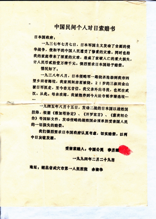 一九三七年七月七日,日本军国主义发动了全面的侵华战争,使平和的中国人遭受了惨重的灾难。同时也给我的家庭带来了深重的灾难,造成了家破人亡的重大损失,计人民币贰拾壹万肆千元。强烈要求日本国给予赔偿。