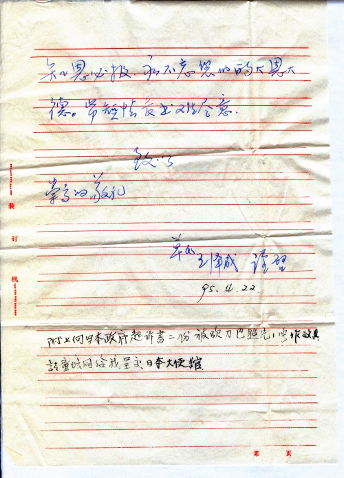 附上向日本政府起诉书二份,被砍刀巴(“巴”编辑为“疤”)照片一张做政具(“政具”编辑为“证据”)
