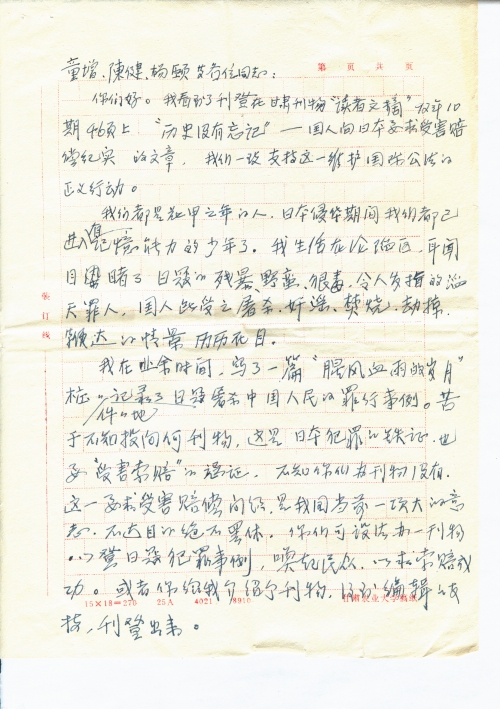我在业余时间,写了一篇“腥风血雨的岁月”桩桩件件地记录了日寇屠杀中国人民的罪行事例。苦于不知投向何刊物,这是日本罪行的铁证,也是“受害索赔”的[旁]证,不知你们办刊物没有。这一要求受害赔偿问题,是我国当前一项大的意志,不达目的绝不罢休。你们可设法办一刊物以登日寇犯罪事例,唤起民众,以求索赔成功。或者你给我介绍个刊物,得到编辑的支持,刊登出来。