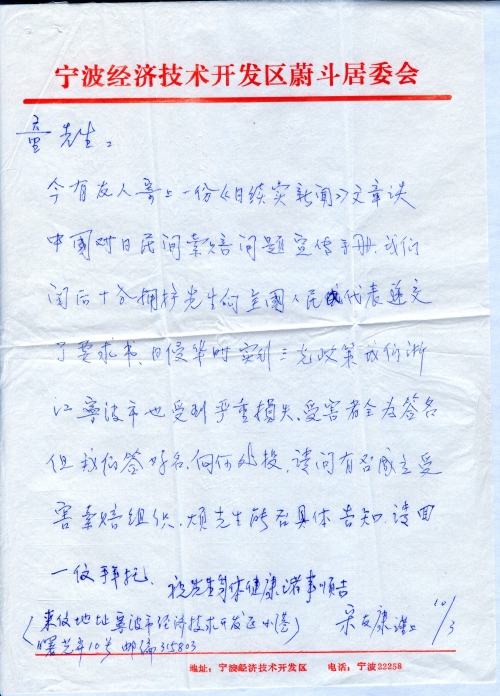 今有友人寄上一份《日续实新闻》文章谈中国对日民间索赔问题宣传手册。我们阅后十分拥护先生向全国人民代表递交了要求书。日侵华时实行三光政策,我们浙江宁波市也受到严重损失。受害者全为签名。但我们签好名向何处投,请问有否成立受害索赔组织,烦先生能否具体告知,请回一信拜托。