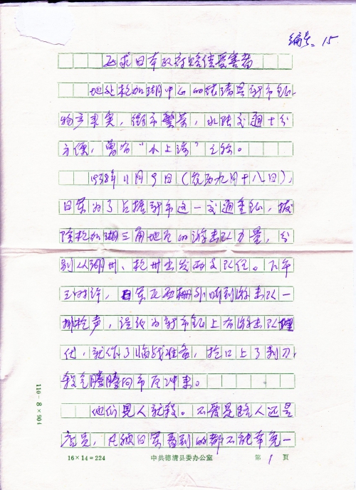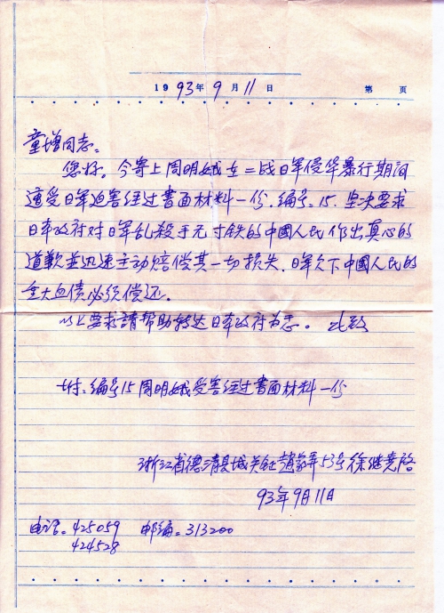 今寄上周明娥在二战日军侵华暴行期间遭受日军迫害经过书面材料一份。编号:15。坚决要求日本政府对日军乱杀手无寸铁的中国人民作出真心的道歉并迅速主动赔偿其一切损失。日军欠下中国人民的重大血债必须偿还。
