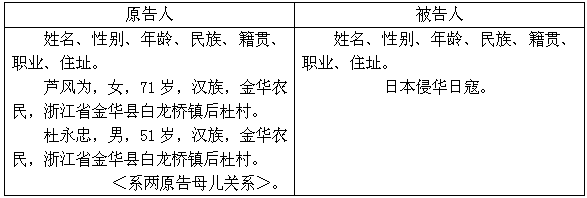事实和理由:1942年间,我丈夫<杜桂标>原在江西省玉山铁路机务段搞修理工作,当时是个铁路工人,被害时当年21岁,我的儿子<杜永忠>还不满周岁,才7.5月,日寇侵华期间,我丈夫为了想逃避不后有的遭难,就从江西省玉山铁路上请假回到自己的家乡<后杜村>避难,不料,我家乡也出现侵华日寇,为此,于1942年8月16日<农历>我丈夫此时无故被日寇抓去,日寇在用毒刑迫害时,当时我后杜村其中有拾余人去向日寇求保(说好话),求保人说:该人是个良民,家有房子,有父母、姐妹、妻子,还有一个不满周岁的儿子<杜永忠>,要求日寇不要无故地杀死我丈夫,当时日寇不仅不肯放过我丈夫,且还当时殴打伤了那些求保的农民同志,随后我丈夫当日就让日寇用刺刀,刺了数刀,活活地被刺死。此刻,杜桂标的父亲杜叶森因受日寇的一种毒恶的战争工具<细菌武器>[中]毒伤害严重后不到三个月也去世了,我一家人即年就被日寇害死二人,只留下我和我的儿子<杜永忠>两人,此间生活过的极为艰苦,这是可想而知的,为此,今天有了党的领导,又有了人民的好儿子<童增>依法帮助我们这些无故遭受苦难的人民[伸]张正义。此时,我妖气依据国际法《雅尔塔协议》、《开罗宣言》、《波茨坦公告》等一系列国际法文件规定向发动侵略的战败国对战胜国支付必要足够的金额,赔偿民间损失费,待请全国人大常委会尽快采取得力措施,为国受害者出大力,向日本索取回依法应早该要回的必要民间损失赔偿费。