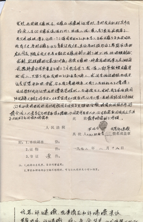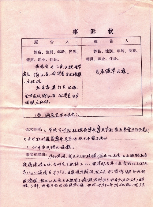 细节:1942年我丈夫杜桂标在江西省抚州市云山铁路段工作,被日军抓去,并打死。丈夫的父亲杜叶森被日军的细菌战残害,特要求日本赔偿。