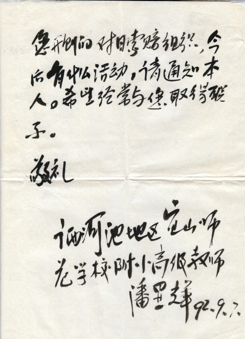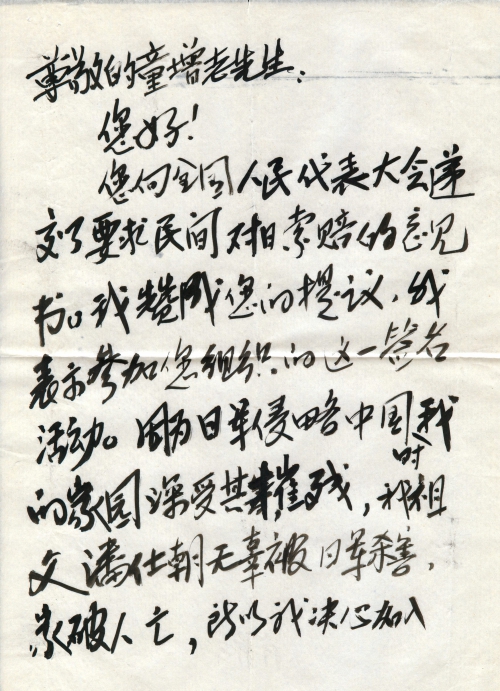 您向全国人民代表大会递交了要求民间对日索赔的意见书。我赞成您的提议,我表示参加您组织的这一签名活动。因为日军侵略中国时,我的家园深受其摧残,我祖父潘仕朝无辜被日军杀害,家破人亡,所以我决心加入您开创的对日索赔组织,今后有什么活动,请通知本人。希望经常与您取得联系。