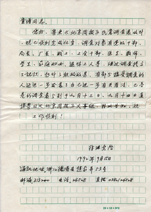 细节:您寄来的《北京周报》的民意调查表我已经收到,我组织调查了多个阶层,调查表已经寄回《北京周报》,特此告知。