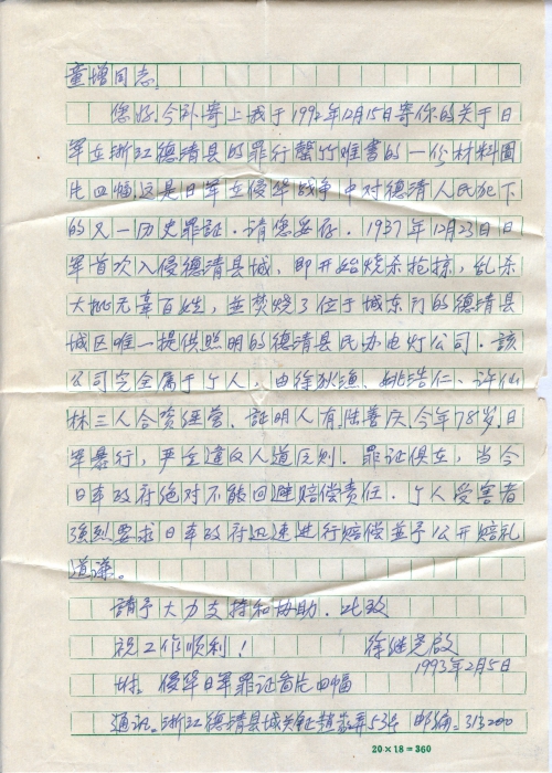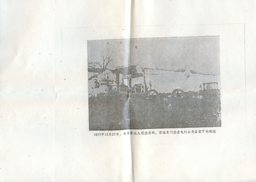 您好。今补寄上我于1992年12月15日寄给你的关于日军在浙江德清县的罪行罄竹难书的一份材料图片四幅,这是日军在侵华战争中对德清人民犯下的又一历史罪证,请您妥存。1937年12月23日,日本首次入侵德清县城,即开始烧杀抢掠,乱杀大批无辜百姓,并焚烧了位于城东门的德清县城区唯一提供照明的德清县民办电灯公司。该公司完全属于个人,由徐狄渔、姚浩仁、许仙林三人合资经营,证明人有:陆善庆,今年78岁。日军暴行,严重违反人道原则。罪证俱在,当今日本政府绝对不能回避赔偿责任。个人受害者强烈要求日本政府迅速进行赔偿并予公开赔礼道[歉]。