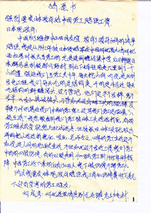 中国为了维护中日两国友谊,放弃了政府之间的战争赔偿。我是从1942年被日本侵略军在中国河北省大消河北面扫荡时抓去当劳工的。先是送到塘沽集中营,后又押送日本群马县利根郡月野村,到后下火车往南走六里到了一个山沟里,强迫我们当劳工共4年,每天挖山涧,听说是水力发电工程。我们每天吃的是猪狗食,干的是牛马活,每天吃猪狗的料糠窝头,还不管饱。他们还冬不发棉,夏不发单,只发了一块破被头。不管如此还有日本工头的棍棒,皮鞭不时的落在我们中国的劳工身上,还骂我们劳工是混蛋,“八格亚路”,我亲眼看到我们劳工被日本工头活活打死,有的劳工难以忍受就想方[设]法逃走。但被抓回,日本工头就放出洋狗把人活活折磨死,咬死,总而言之,四年的劳工生活还不如说是人间的地狱生活。不但如此,还不发给工资,我们劳工中有的四肢伤残,有的双眼失明。400多名劳工到1945年日本投降,中国劳工活下来的仅有130多人,我下肢伤残不能劳动。