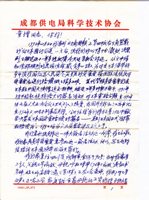 1993年2月3日我看到“文摘周报”上第四版右下角登载的“向日本国讨公道”一文后,使我们的心情十分激动,没想到已经过五十一年多的血债,今天还有机会讨还。从文中得知你那强烈的民族使命感,全身心投入,为过去日本侵华战争中使我国亿万人民受尽灾难的受害者,按国际法规定对受害者应进行赔偿做了很多工作。并代替很多受害者们去日本驻中国大使馆递交材料,经过三年多的努力奋斗,1991年8月开始起规模浩大的签名活动,对日本索赔问题,在1992年3月七届人大五次会议上正式列入了提案,我国外交部和江总书记在1992年三、四月分别表态支持。公开信称“我们将征集1亿中国人坚决要求日本国受害赔偿的签名——直到日本国正式谢罪和赔偿为。”谢谢你为广大受害者伸出正义之手。