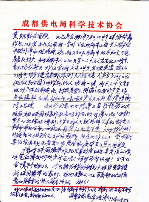 我们愿积极支持这一伟大签名活动,这一创举,我已62岁了,我们家是具体受害者,愿参加这一签名活动,所以,写出这封信,控诉日本国侵华的滔天罪行。