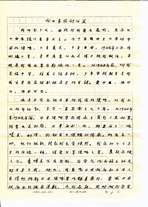 I will never forget Japan’s invasion against China. I’ve been thinking about this since I was very young. From 1940 to 1942, the invading Japanese army implemented the Three Alls Policy (kill all, burn all, loot all) at my hometown. They raided my hometown repeatedly and wherever they went, they burned, raped and robbed, leaving a tragic sight. All this is still a fresh memory to me and makes me feel creepy. My family, like thousands of other families, badly suffered from Japan’s aggression. Director Tong Zeng is smart and righteous and enlightens me. Now, I will indignantly charge the invading Japanese army with barbaric crimes in front of the Japanese government and people. I demand the Japanese government to genuinely apologize and make compensation. The invaded country actually compensated the invading countries. Only China did that. How weird is that! How could China let that happen? China is too tolerant of the invaders. Now, I charge the invading Japanese army with killing my families and relatives and make it public. It is a truth that invading countries should take the responsibility.