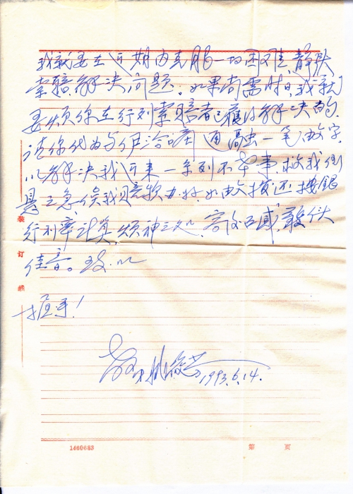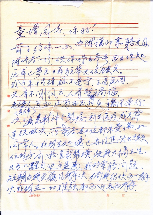 我们来情绪,极不安宁,主要原因,天有不测风云,人有暂时祸福。老爱人(老伴)因血压高而去世矣。祸不单行,次子罹患精神分裂症,刻在医疗,我又不幸连跌数次,所幸各部位都未受伤,如同常人。我现在处境已弄的焦头烂额,住的房间,终重新装潢,既能大搞卫生,又可以醒目,延年益寿。我的索赔问题,短期内能否获得解决,尚能很快可以解决我现在一切难题,都可以迎[刃]而解。