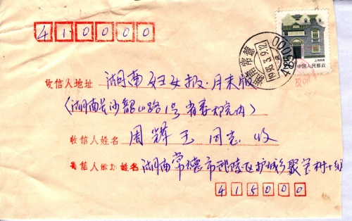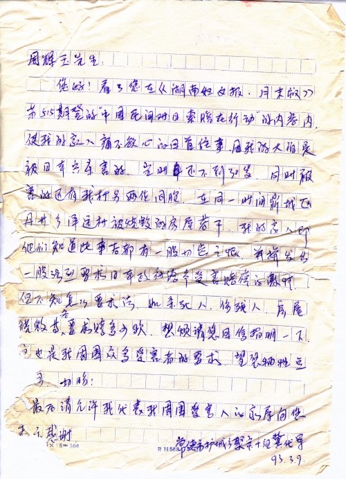 看了您在《湖南妇女报•月末版》第515期登的“中国民间对日索赔在行动”的内容内,使我的家人痛不欲生的回首往事,因我的大伯是被日本兵杀害的,当时还不到30岁,同时被害的还有我村另两位同胞。在同一时间鼎城区丹州乡泽远村被烧毁的房屋若干,我的家人即他们知道此事后都有一股切齿之恨,并[迸]发出一股强烈要求日本政府给予受害赔偿的激情,但不知怎么要求法,如杀死人、伤残人、房屋烧毁等各要求赔多少款,想烦请您回信指明一下,这也是我周围众多受害者的要求,望您牺牲点时间。切盼!
