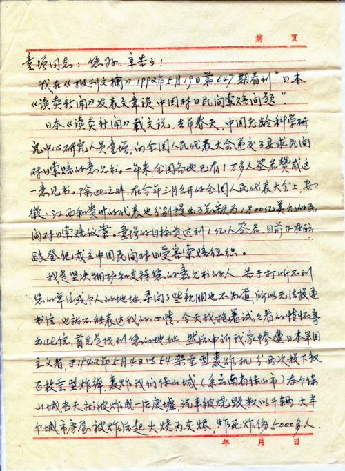 I firmly support your opinion letter. I cannot deliver this letter to you because I don’t know the address of your organization or your home despite exhausting inquiry of all sources. So I cannot express my feeling. Today, I decided to give it a try and send this letter to you, first of all I found out your address and then make an appeal. On May 4, 1942, the Japanese militarism sent 54 heavy bombers to drop hundreds of giant bombs, two times in Baoshan city (Baoshan, Yunnan). The whole city was bombed to ruins that day. Thousands of vehicles were burned and destroyed, houses were mostly burned to ashes and over 5,000 people were killed or injured.