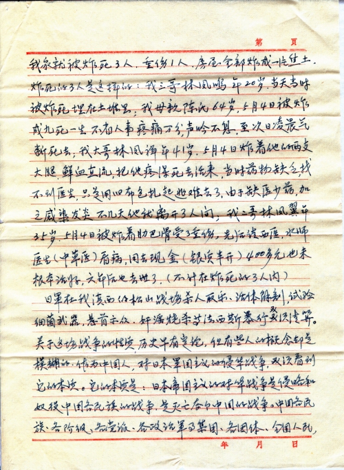 Three members of our family were killed and 1 was seriously injured. The houses were bombed to dust. The 3 dead people were my 20-year-old third elder brother Lin Fengming who was bombed and buried in dust, my 64-year-old mother Mrs. Chen, who was seriously injured, unconscious and groaning with excruciating pain by the bombing. On May 4 early in the morning she took her last breath and died. Two legs of my 41-year-old elder brother, Lin Fengxiang, were torn by bombing, with blood gushing out from his wounds. He suffered excruciating pain on May 4. Due to the lack of medicine and doctors, we just bandaged his wounds with old cloth and ran away for our lives. He died several days later due to infection and inflammation. My 35-year-old second elder brother, Lin Fengyi, suffered serious injury in the rib area by the bombing on May 4. We sent for western and traditional doctors to treat him and spent over 400 yuan (cash and silver), but he was not completely cured and died six years later (excluded from the three people who were bombed to death).