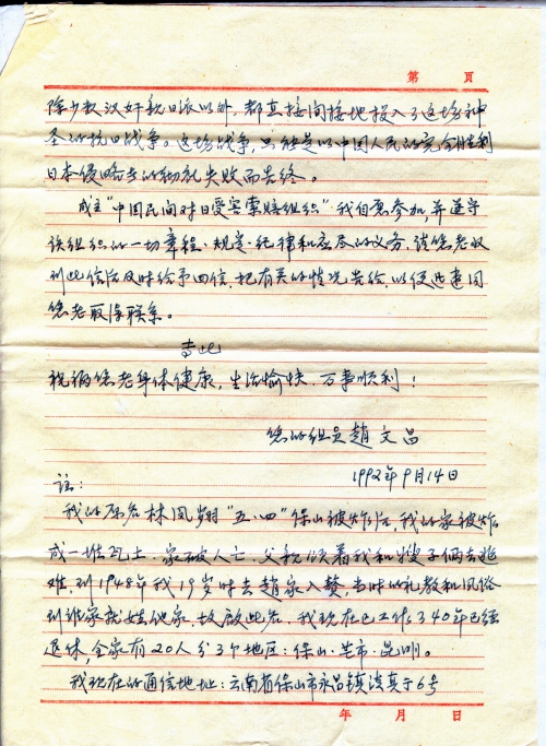 My original name is Lin Fengxiang. After the May 4 Baoshan Bombing, our house was bombed to dust and my family was broken to pieces. My father took me and my first sister-in-law to escape. I was married into a family with the surname of Zhao in 1948 when I was 19 years old. At that time, it was customary to use the surname of the family that you were married to and lived with. So my name was changed to Zhao Wenchang. Now, I retired after working for 40 years and all 20 family members live in 3 cities: Baoshan, Mangshi and Kunming.