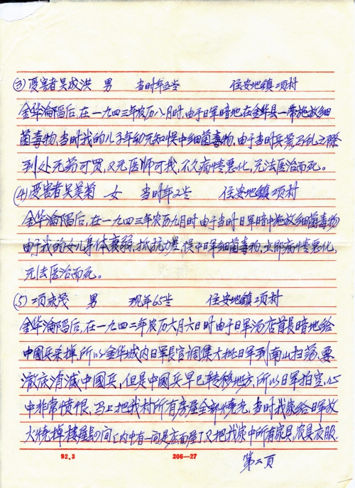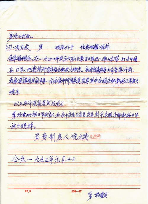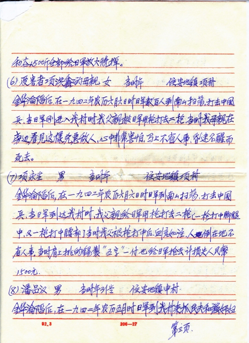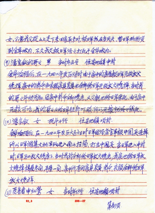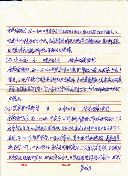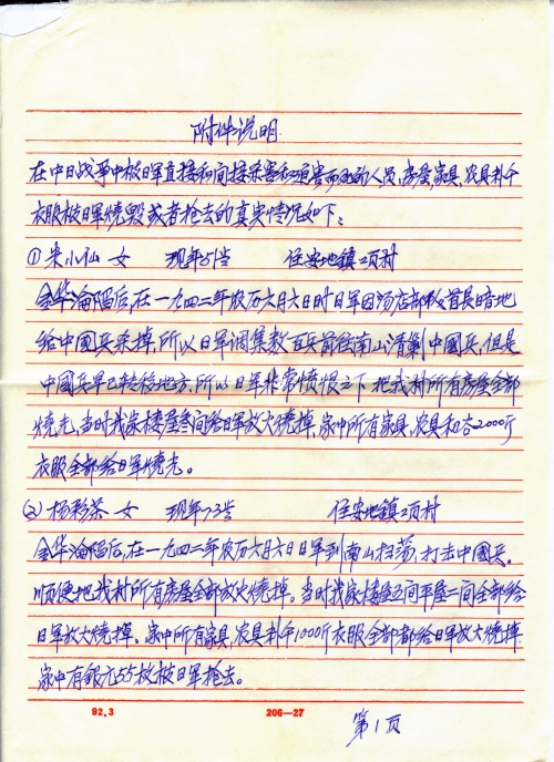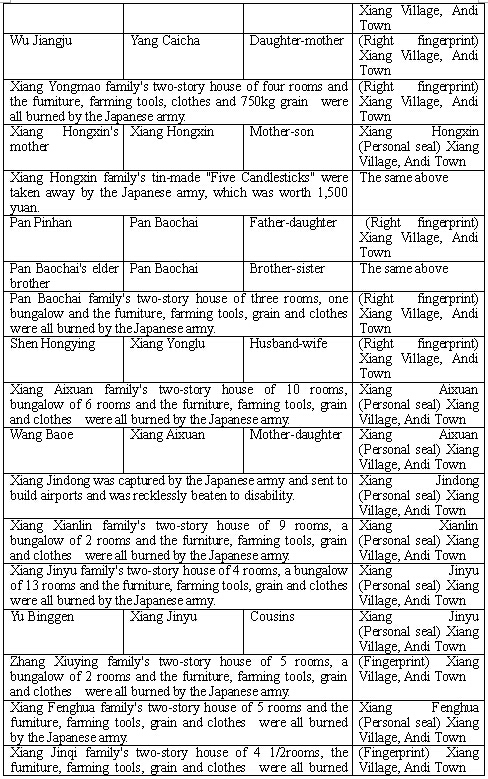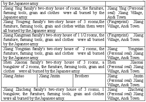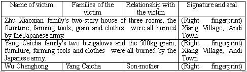 After the fall of Jinhua, the Japanese army raided Nanshan on lunar June 6, 1942 to eliminate Chinese soldiers and on their way they burned all houses of my village. My family’s two-story house of 5 rooms, a bungalow of 2 rooms, the furniture, farming tools, 500kg grain and clothes were all burned by the Japanese army and 55 silver coins were robbed by Japanese army.