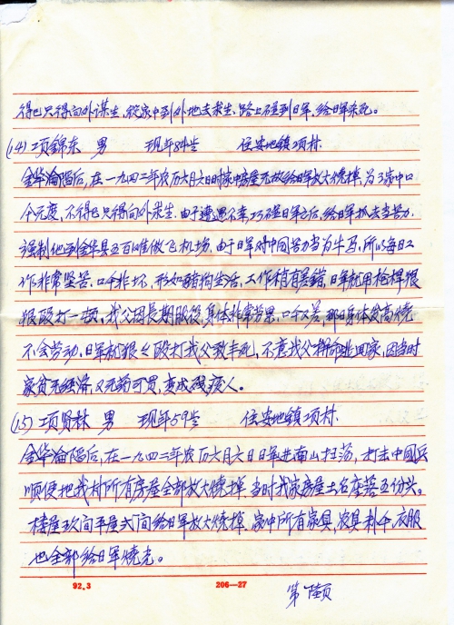 After the fall of Jinhua, my family’s house was burned by the Japanese army on lunar June 6, 1942. My father had to leave the hometown to make a living. Unfortunately, he encountered Japanese army and was captured to be a laborer. He was forced to build an airport at Wubaitan, Jinhua. The Japanese army treated Chinese laborers like animals, so he had to do heavy work every day. The food was very bad and they lived like animals. Besides, even with the slightest error in work, they would be beaten badly by the Japanese army using gun-stock (?). Due to long-term heavy work, exhaustion and bad food, my father caught a fever one day and couldn’t work. He was brutally beaten to half death. Luckily, he tried hard to escape to go home. But then we were poor and had no medicine to buy, so my father became disabled.