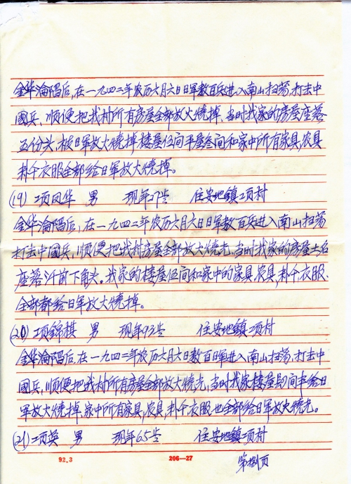 Other details:In 1942 Zhu Xiaoxian, Yang Caicha, Xiang Yongmao and other families’ belongings were burnt. In 1943, Wu Chenghong’s son and Wu Jiangju’s daughter died of Japanese bacterial infection. Pan Lvhan’s father was forced to be a porter and killed by Japanese. Pan Baochai’s family belongings were burnt and her father was killed by Japanese troops. Wang Bao’e, Yu Binggen were killed. Xiang Jindong was forced to do labor work by Japanese and got disabled. Xiang Jinshi was also forced into labor and killed. The victims added up to 27.