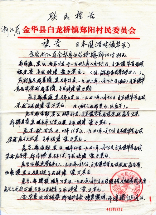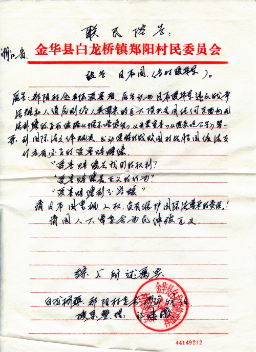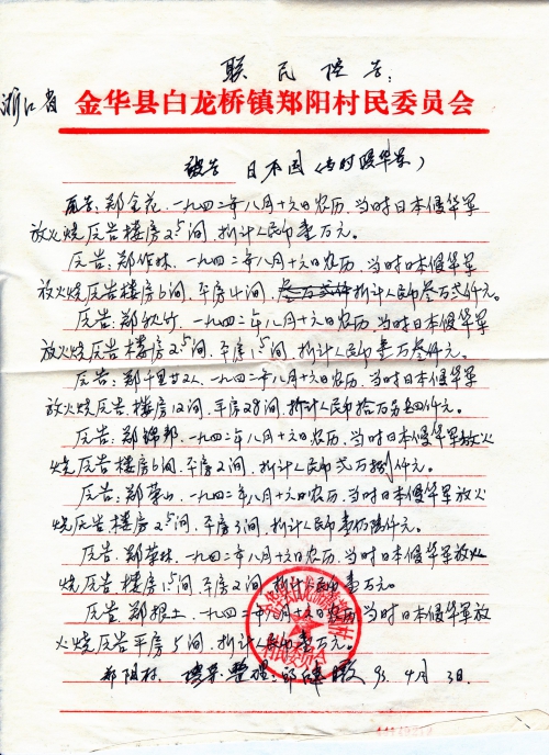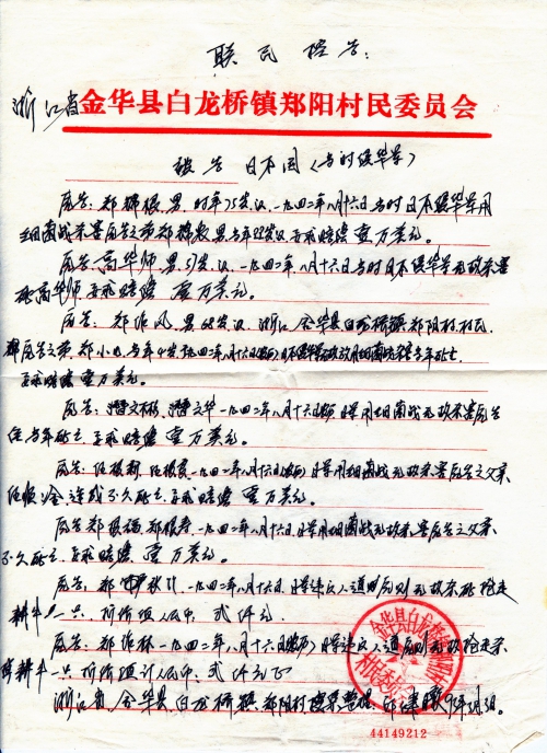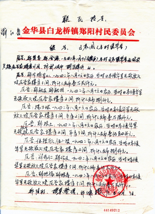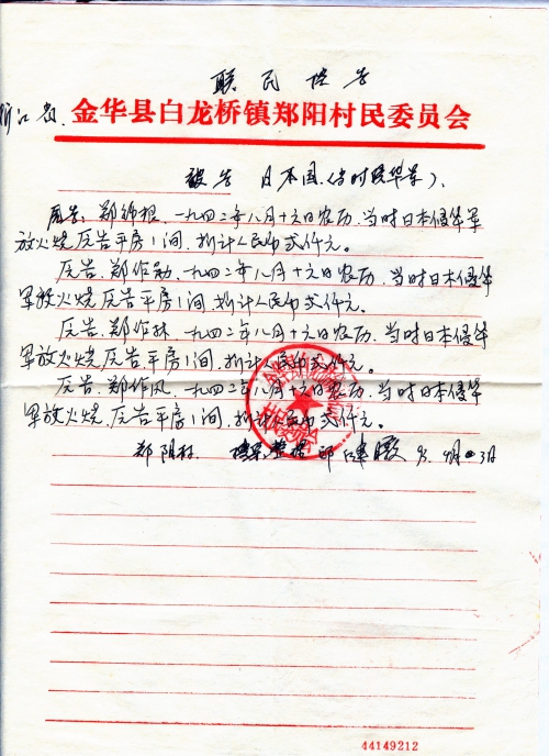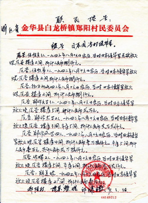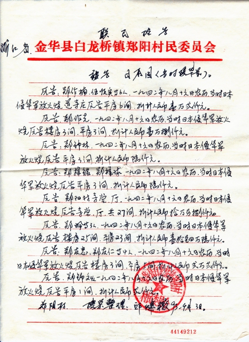 Other details:On August 16th 1942 on the lunar calendar, dozens of houses were burned by Japanese, including houses of Zheng Xianzhong, Zheng Jinhai, Zheng Zuonan, Zheng Nengyou, Zheng Nenggui, Yang Xueqiu, Zheng Gentu, Ren Gengeng, Zheng Zuoren, Zheng Zuoyi, Zheng Genfu, Zheng Genshou and others. People died in Japanese germ warfare were Zheng Jingen’s brother Zheng Jinnong, Zheng Zuofeng’s brother Zheng Xiaoer, Qian Wenbin, Qian Wenhua, Ren Xingen’s father, Zheng Genfu’s father, Zheng Fagen, etc. Those killed by Japanese for no reason were Gao Huashi, Zheng Zuosen, Zheng Shanqing, Zheng Chunhai, Zheng Zuoxun’s father Zheng Jin and brother, Yu Jinhua’s father, Ren Shunxi and so on. Zheng Qiuzhu and Zheng Zuolin’s cattle were looted. The letter contains stamped proof document by village committee. Zheng Xiaoshi’s grandfather was arrested as a war prisoner and has not been heard from ever since.