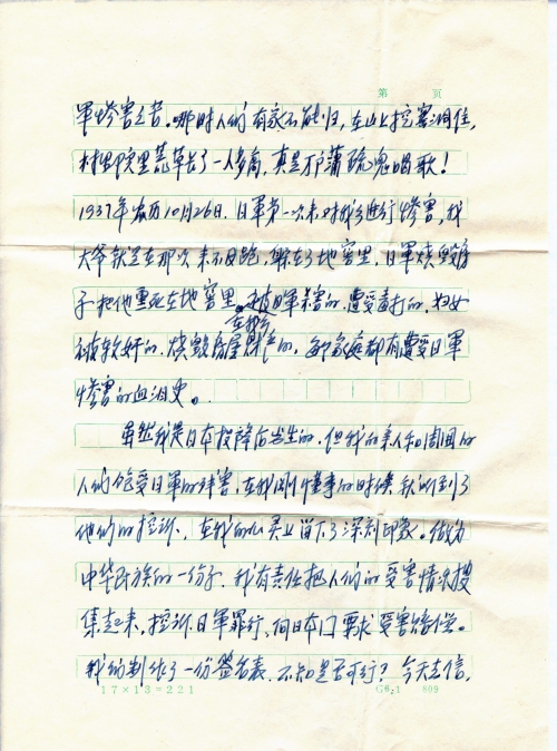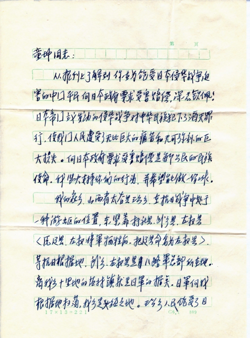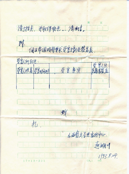 虽然我是日本投降后出生的,但我的亲人和周围的人们饱受日军的残害,在我刚懂事的时候,就听到了他们的控诉,在我的心灵上留下了深刻印象。作为中华民族的一份子,我有责任把人们的受害情况搜集起来,控诉日军罪行,向日本国要求受害赔偿。我们制作了一份签名表,不知是否可行?今天去信,请予指点,并取得联系。请回信。