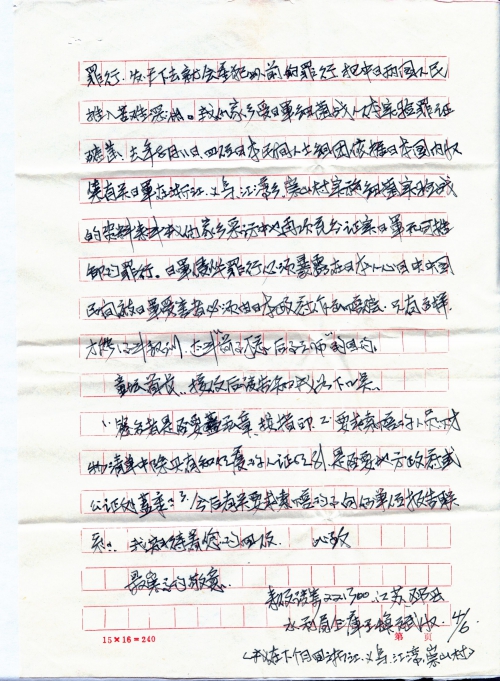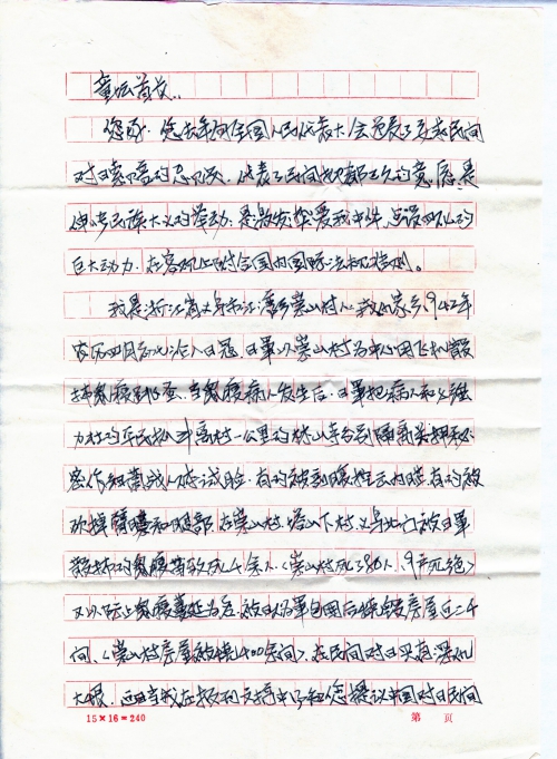 You submitted to the National People’s Congress an opinion letter about claiming for civilian compensation from Japan last year. Your righteous act represents the long-suppressed will of the people, serves as a great force to build “four modernizations” (industrial modernization, agricultural modernization, modernization of national defense, science and technology modernization) and objectively complies with domestic and international regulations.