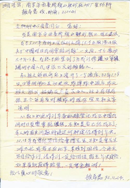 从报上知道你们准备酝酿登记成立中国民间对日受害索赔组织,不知是否已经成立了。本人的有关问题将通过何种途径得到[解]决。10.15号我曾经写信给童增先生,不知是童先生工作太忙,或者不在北京,未收到回信。今再次写信给你们,请你们一定给回信,指点[解]决途径。如果真能获得赔偿,一定重金相谢!