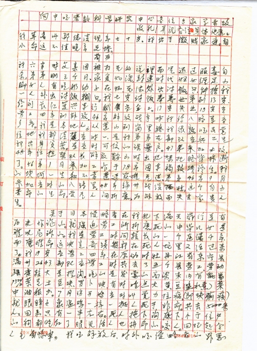 我六岁时,父亲因被打无处说理而气不过服毒自杀。弟弟刚三个月,家贫如洗,封建时代妇女缠足,小脚女人有吃奶幼子在怀,无法外出讨饭,只能舍我一人外出讨饭糊口。我七岁讨饭奉养母弟到13岁,给刘长仁复兴车行当全工。17岁失业,19岁当劳工四年到解放。46年解放战争时我给八路军当[向]导,我是本地人。从莲山到岗里路我很熟,国民党[驻]地我都清楚,当时一是我弟弟在部队当兵工,是我出身贫苦,是当时可信的深垒户。47年参加土改,48年任担架队长,解放鞍山时出担架把袼褙摔断了。56年1月参加工作。于78年因车祸致残终生。我的坎坷一生和不孝遭遇实难尽述。弟弟46年9月参加当时的八路军,48年绵州战役牺牲,这个自小苦命的生命,受尽人间折磨,为解放而失去宝贵人生。