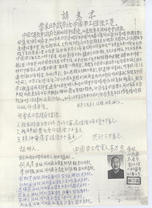 Demanding the Japanese government to pay compensation salary to Chinese forced laborers