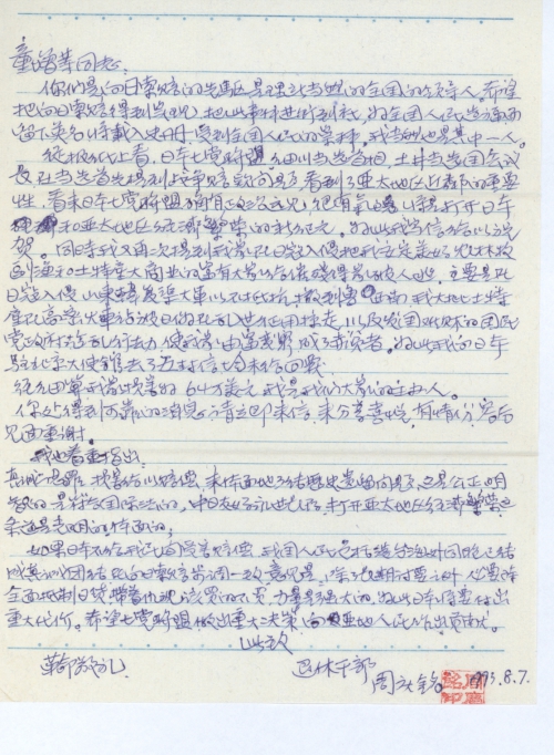 从报纸上看,日本七党联盟,细川当选首相,土井当选国会议长,在当选首先提到战争赔偿问题,看到了亚太地区近邻的重要性,看来日本七党联盟却有政治远见,很有气魄,将是打开日本和亚太地区经济繁荣的新纪元。特此我写信给以祝贺。同时我又再次提到我家在日寇入侵把我安定美好农林牧副渔和土特产大商业的富有大家给摧残得家破人逃,主要是在日寇入侵山东韩复渠大军以不抵抗撤到鲁西南,我大批土特产在高密火车站被日伪在乱世征用掠走,以及发国难财的国民党政府趁乱行劫,使我家由富变穷,成了赤贫者。为此我向日本驻北京大使馆去了五封信均未给回覆。