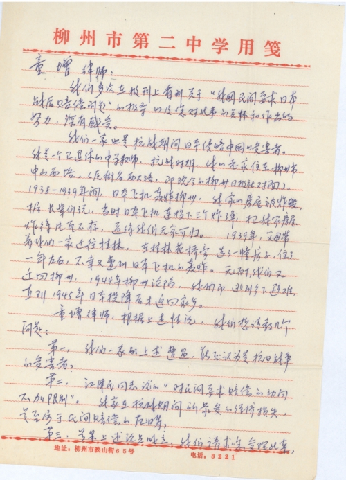 我们一家也是抗战期间日本侵略中国的受害者。我是一个已退休的中学教师,抗战时期,我的老家住在柳州市中山西路,(原街名西大路,即现今的柳州日报社对面)。1938-1939年间,日本飞机轰炸柳州,我家的房屋被炸毁,据长辈们说,当时日本飞机连投下三个炸弹,把我家房屋炸得片瓦不存,逼得我们无家可归。1939年父母带着我们一家迁住桂林,在桂林花桥旁选了一幢房子,住了一年左右,不幸又遭到日本飞机的轰炸。无[奈]我们又迁回柳州,1944年柳州沦陷,我们即逃到乡下避难,直到1945年日本投降后才返回家乡。