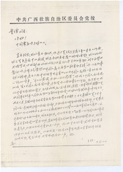直言相见,我们素不相识,你还只是将近不惑之年的专业工作者,我已是年逾花甲的教授,我还承担着重要的科研课题,我的时间也很紧迫,但我却在此时此刻怀着向你学习的意愿,情不自禁地要向你这样正气凛然的中国人表示应有的敬意和支持,你以无私奉献的精神,道出了在中日战争中受害的亿万中国人长期以来积压在心底的呼声。“千人之诺诺,不如一士之谔谔”,你说了中国人应该说的话,管了中国人应该管的事,这就是你人格和骨气的所在。无可否认,我们中华名族胸怀宽广,民族仇恨应该积极消除,非常难能的是我国早已放弃了国家应有的巨额战争赔偿,但我们怎能放弃伸张正义,讨还公道,怎能放弃民间受害者应有的赔偿于不顾?十分遗憾的是广大中国人民,包括我这样的教授老干部,不知道向哪里呐喊和投诉,只是最近我才从四川日报社主办的《文摘周报》上刊登的《向日本国讨公道》一文中看到了这方面的信息,我不无感动。你已经唤起了证索一亿中国人向日本国要求受害赔偿的签名活动,直到日本国正式谢罪和进行赔偿为止,我将不遗余力,不惜付出代价参加这一活动,为此专函致意,尤盼告知签名活动的方式及要求。山西代县一亲友任常有为其父受害投诉致函向你求助,是否收到,也望顺便告知一声。祝