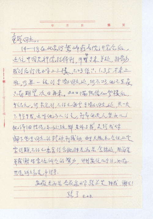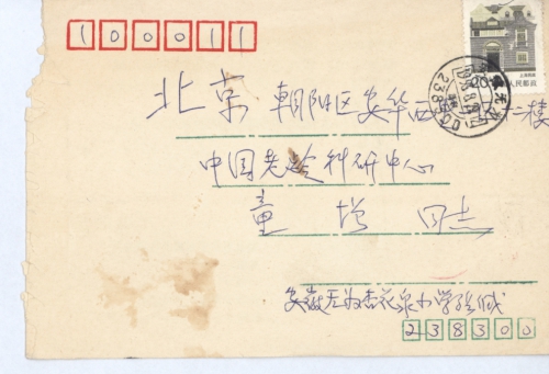 14-18在此写于鹫峰疗养院开完会后,迁往中国农科院招待所,19日专车尊处,好容易找到后门经小学上三楼,不料你只1、3、5才来上班,乃再一站到于渤同志处,仍不巧,他不在家,只有期望次日再来。20日满怀信心登楼后,等很久,仍未见到,不得已再去于渤同志处,头一天下午曾等我,这时他与人约走,所幸他夫人和女儿把详细情况和处境都告诉了我,更增我对阁下及于同志的精神所感动,由于天热和会议上党票到期,不得已离京到合肥转无为县舍妹处,特简告并感谢对索赔所做的努力。计划要住几个月,如有情况予请寄: