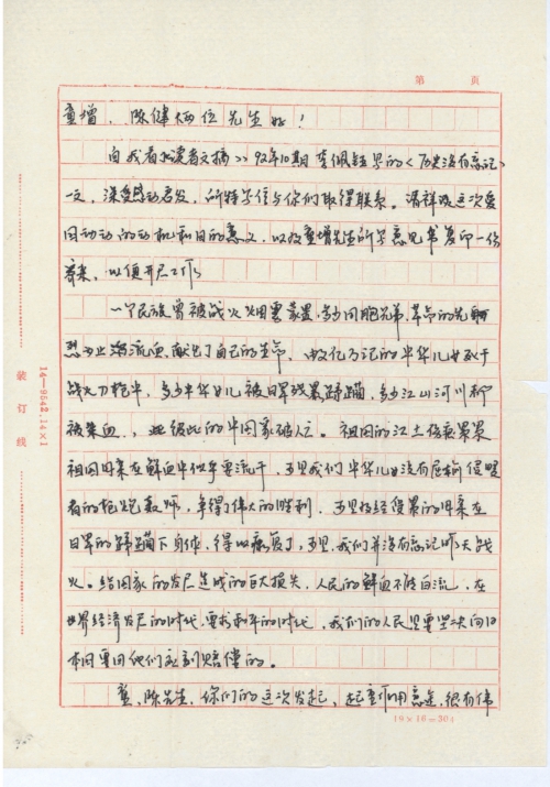 自我看了《读者文摘》92年10期李佩钰写的《历史没有忘记》一文,深受感动启发,所特写信与你们取得联系。请详谈这次爱国行动的动机和目的意义,以及童增先生所写意见书复印一份寄来,以便开展工作。