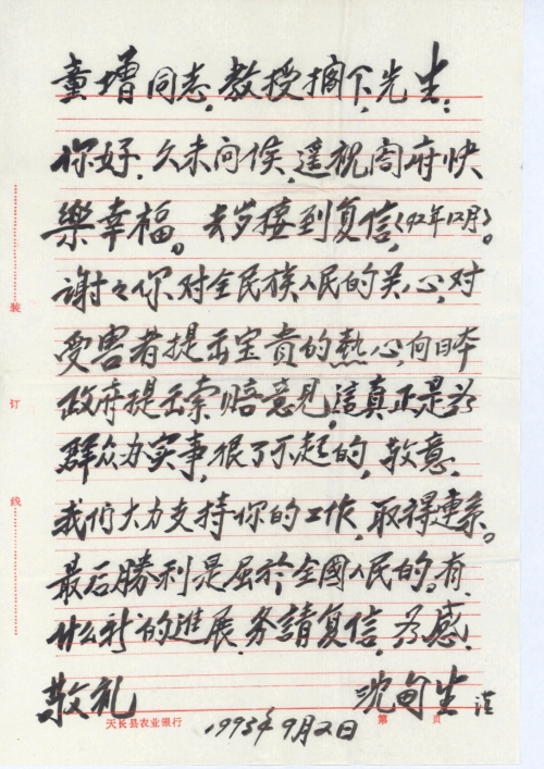 久未问候,遥祝阖府快乐幸福。去岁接到复信<92年12月>。谢谢你对全民族人民的关心,对受害者提出宝贵的热心,向日本政府提出索赔意见,这真正是为群众办实事,很了不起的,敬意。我们大力支持你的工作,取得[联]系。最后胜利是属于全国人民的。有什么新的进展,务请复信,为感。